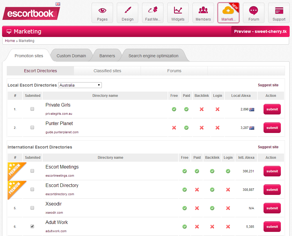 Nevertheless, finding the right directories can be a daunting task in itself. This is why Escortbook offers you an easy and fantastic tool that can help you choose what directories to list in, as well as traffic data for each. In order to view them, simply log in to your escort account, and click the “Marketing” button in the top menu. The first tab to open will be one listing local escort directories and directly below them, international escort directories. We always place our personal favourites at the top, so be sure to check those out. Two of our favourites include escortmeetings.com and escortdirectory.com. They’re reliable and updated on a constant basis.