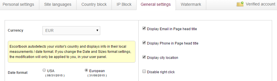 the Settings Tab of your Escortbook Control Panel: